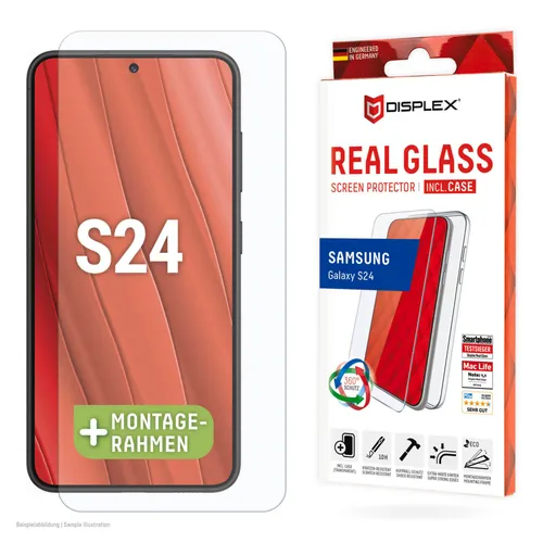 Real Glass & Case für das Samsung Galaxy S24Das transparente TPU-Case schützt und hält zuverlässig - mit einem angenehmem Grip. Die Schutzhülle ist extra-dünn (0,12 cm) und ultra-leicht und beeinträchtigt durch den dezenten Look die Haptik und Optik Ihres Smartphones nur unwesentlich. Für die optimale Bedienung sind die Druckpunkte und der Kamera-Schutz erhaben.Das Displex Panzerglas hat einen Härtegrad von 10H und ist damit nicht nur kratz-, bruch-, und stoßfester als vergleichbare Markenprodukte, sondern übertrifft sogar hochwertiges Saphirglas (9H), das bei Luxusuhren eingesetzt wird. Die Kanten, die bruch- und stoßanfälligste Zone des Smartphones und Schutzglases, sind spezialgehärtet, durch eine mehrfache Polierung abgerundet und mit einer Schock-absorbierenden Kante (bei Full Cover Schutzgläsern) veredelt. Durch dieses aufwendige Produktionsverfahren wird das Schutzglas extrem widerstandsfähig gegen Schläge, Stöße und Bruch und ist zugleich besonders angenehm bei der Nutzung.Das Schutzglas wird bis auf 5/100 mm genau auf die Smartphone Konturen gefertigt und passt somit perfekt auf Ihr Smartphone. Außerdem ist die Schutzfolie ultradünn. Somit lassen sich alle handelsüblichen Schutzhüllen & Cases mit der Panzerglasfolie benutzen. Durch einen kombinierten Schutz aus Displex Tempered Glass und Ihrer Lieblingshülle wird Ihr Smartphone rundum optimal geschützt.Die oberste Schicht der 4-Layer Technology besteht aus einem High-Tech Plasma Coating. Die hydro- und oleophobe Anti-Fingerprint-Beschichtung ist fett- und schmutzabweisend, extrem langanhaltend und gewährleistet optimalen Touch und Scrollen. Durch diese Technologie sieht Ihr Display nicht nur schöner aus, sondern bleibt auch länger sauber und muss somit seltener gereinigt werden. Hinweis: der Displex Screen Protector unterstützt auch den 3D/ Haptic Touch (Apple) und die Fingerprint-Sensoren aller Smartphone Hersteller.Der im Real Glass integrierte High-Tech Splitterschutz von Displex gewährleistet absolute Sicherheit, auch beim Bruch des Panzerglases. Durch das Verbundmaterial der zweiten Schicht im Schutzglas splittert dieses nicht und garantiert somit eine absolut sichere Verwendung. Und wenn es doch zum Ernstfall kommen sollte und das Schutzglas einen Schlag, Fall oder Stoß abgefangen hat und gebrochen ist, dann kann das Displex Schutzglas durch den integrierten High-Tech Splitterschutz problemlos in einem Stück vom Display abgezogen werden.Nach der Montage des Schutzglases sorgt das Hochleistungs-Silikon für optimale Haft-Eigenschaften und eine klare Optik. Damit die Handy-Schutzfolie langfristig und zuverlässig hält, ist das Silikon auf alle Display-Beschichtungen der verschiedenen Hersteller angepasst. Auch die Optik wird dabei nicht beeinflusst: trotz Displayschutzfolie können Sie packende Videos und Fotos mit maximaler Transparenz und Farbtreue genießen.Mit dem EASY-ON Eco-Montagerahmen und dem dazugehörigen Video Tutorial gestaltet sich die Montage des Tempered Glass schnell, einfach und exakt. Das Ergebnis: kein schiefes Aufliegen des Screen Protectors auf dem Display, keine verdeckten Öffnungen für Lautsprecher oder Mikrofone und erst recht keine Blasen unter dem Schutzglas. Gut für die Umwelt: der Eco-Montagerahmen besteht zu 100% aus recyclebarem Premium-Vollkarton und kann nach dem Einsatz bedenkenlos mit dem Altpapier recycelt werden.Produkt HighlightsLieferumfangHinweis: Das abgebildete Smartphone ist nicht im Lieferumfang enthalten.