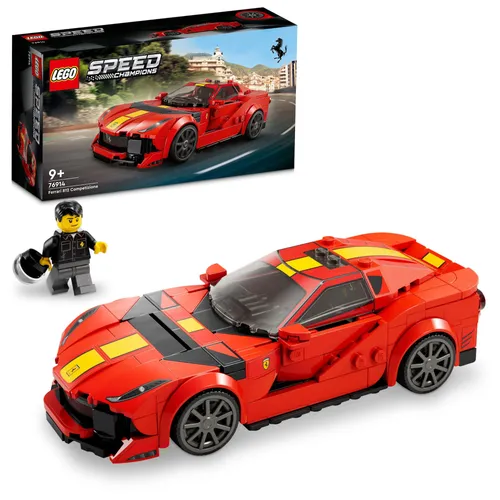 Der LEGO® Speed Champions Ferrari 812 Competizione (76914) ist ein Bauset, das die Power, Performance und Fahrdynamik des echten Sportwagens in limitierter Auflage perfekt widerspiegelt. Kinder und Autofans ab 9 Jahren können jetzt – zum allerersten Mal – dieses coole Modell bauen und ausstellen.Baue deinen eigenen FerrariDieses rote Ferrari-Spielzeugauto verfügt über viele Details des Originals: den gelben Streifen, der sich über das ganze Auto zieht, die schwarze Lamelle auf der Motorhaube, den ausgefahrenen Heckflügel, die auffälligen Wirbelgeneratoren sowie die markanten Scheinwerfer, Heckleuchten und Auspuffrohre. Darüber hinaus enthält das Set auch eine Rennfahrer-Minifigur, die für spannende Rennen hinters Lenkrad gesetzt werden kann.Faszinierendes digitales Bauerlebnis für LEGO FansDie LEGO Builder App begleitet dich und dein Kind auf ein leichtes und intuitives Bauabenteuer. Vergrößere und drehe 3D-Ansichten der Modelle, speichere Sets und verfolge deinen Baufortschritt.